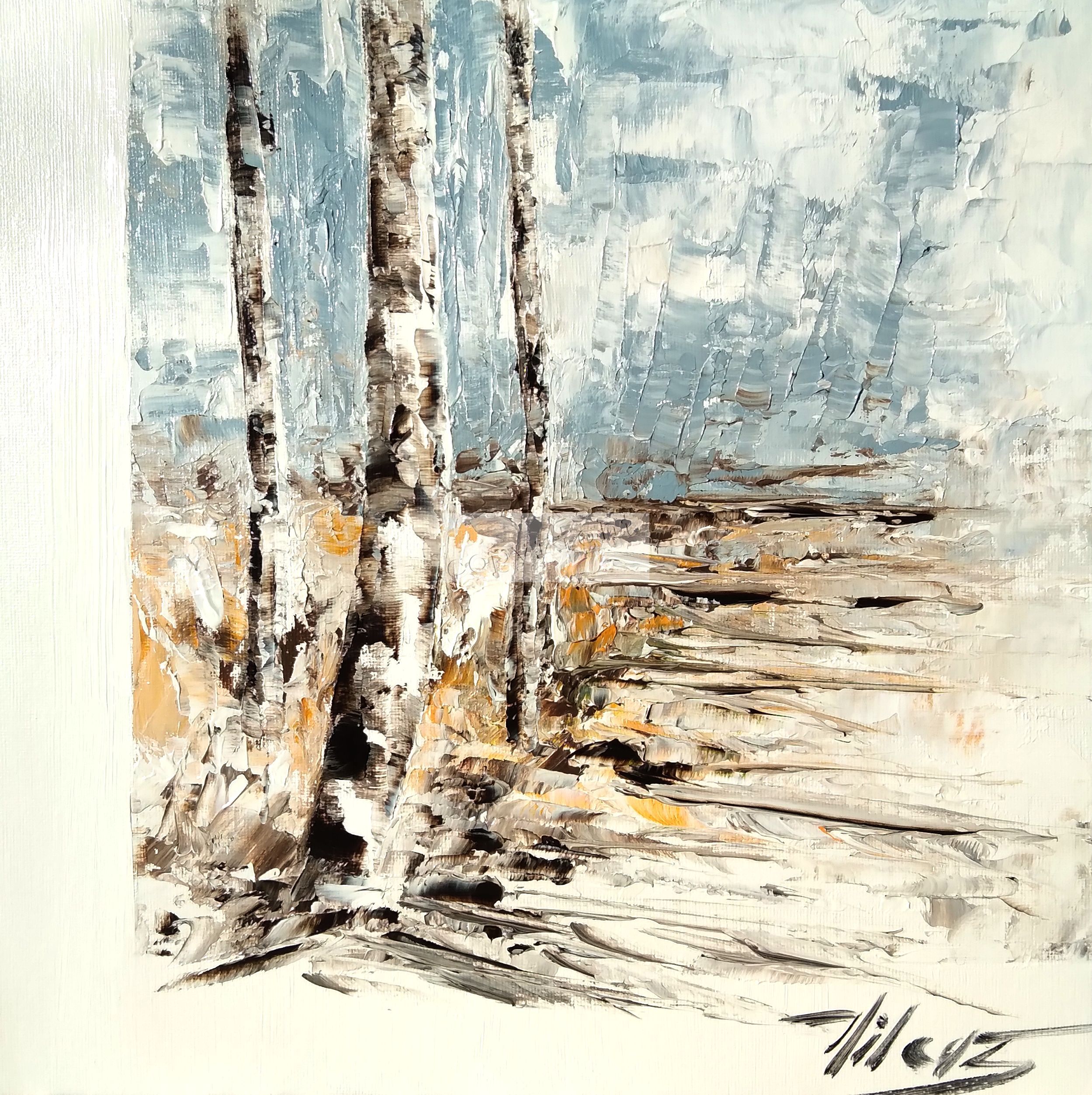 Peinture à l’huile sur toile. Format 30×30 cm. Vendue avec son cadre noir. Dimensions totales 35 x 35 cm. Une belle peinture contemporaine d’un trio d’arbres à glisser délicatement sur les murs de votre maison.